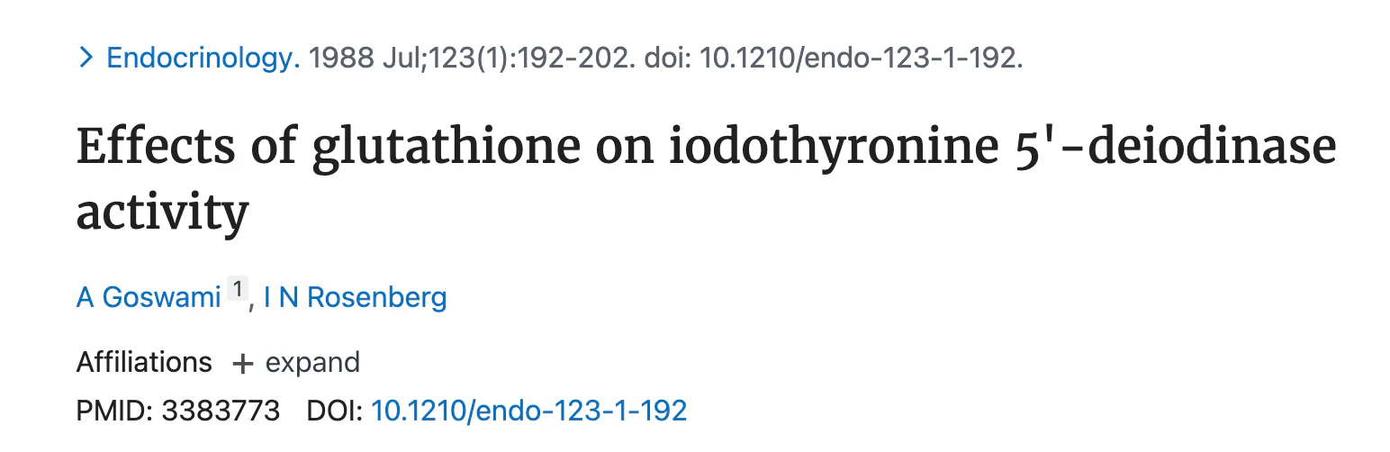 Effects of glutathione on iodothyronine 5'-deiodinase activity: https://pubmed.ncbi.nlm.nih.gov/3383773/