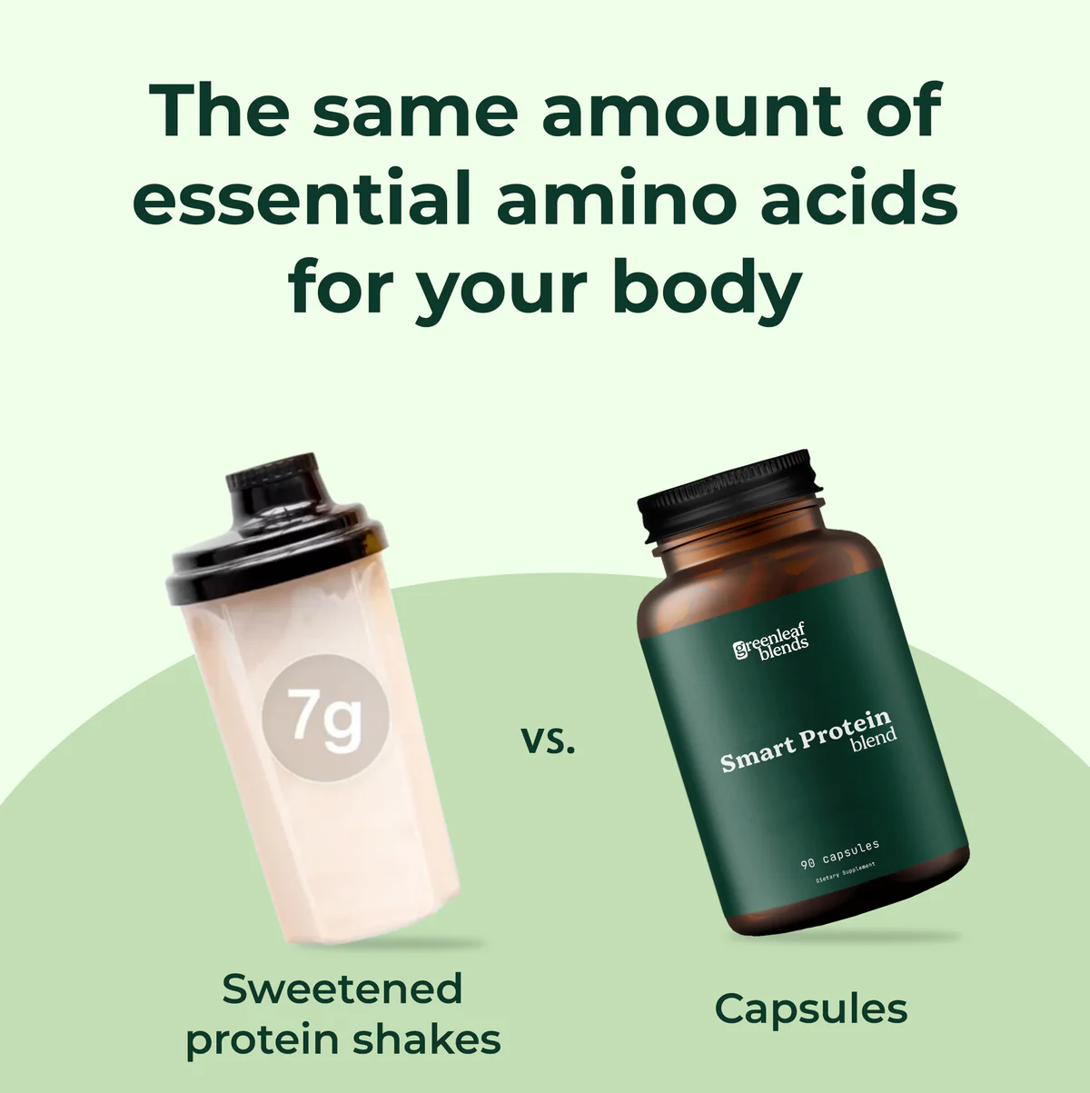1 Pressling Smart Protein Blend corresponds to the same amount of essential amino acids that can be used for cell building as 7g of protein shakes. This means that 1g of Smart Protein Blend (1 pellet) has the same effect as 7g of protein from protein shakes.